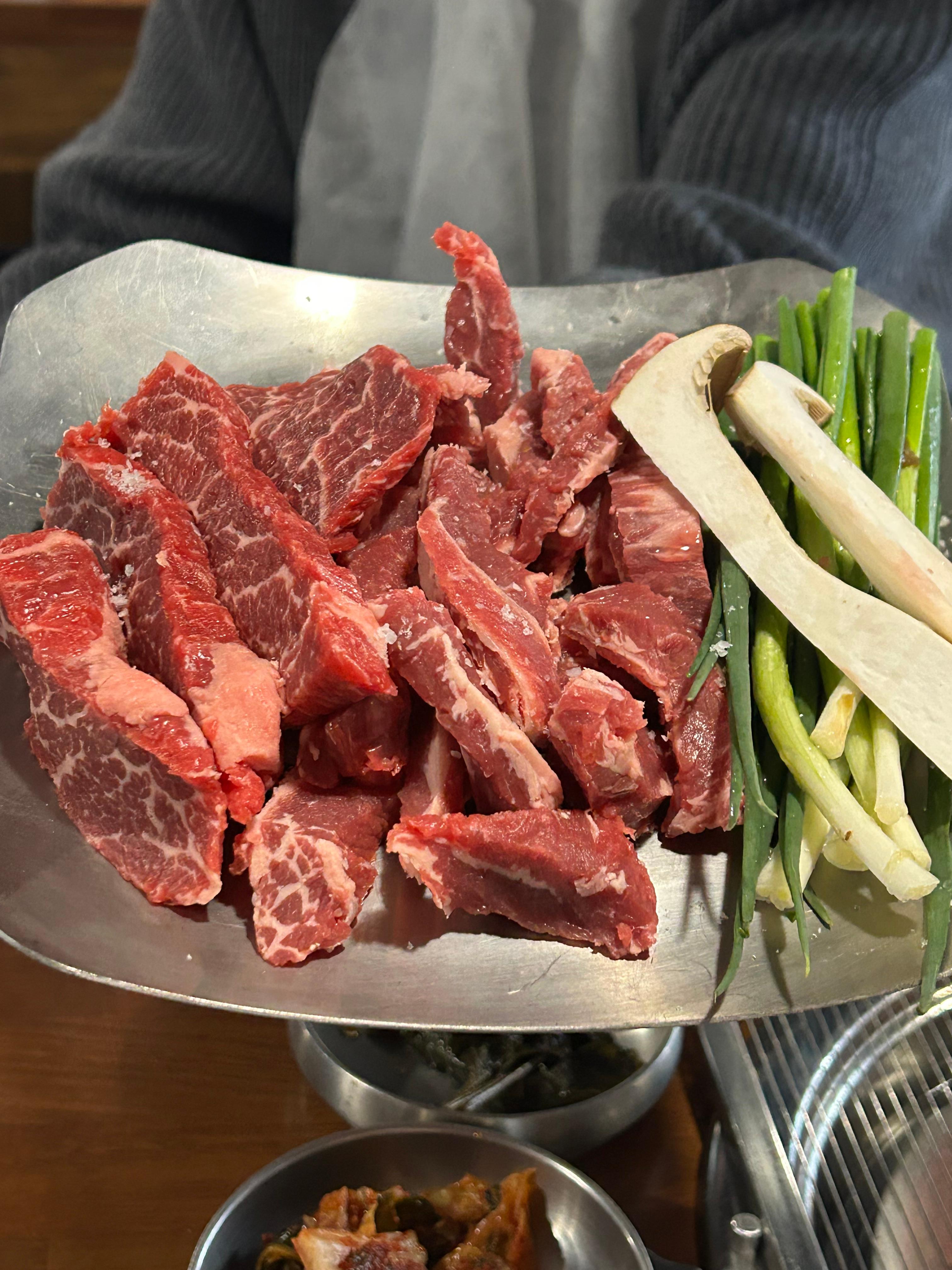 고기 때깔이 장난 아니죠??? 이렇게 갈비 한 판이 나오는데, 옆에 쪽파는 같이 구워 먹으면 진짜 맛있습니다..!! 먹기 좋은 크기로 버섯이랑 구워 먹으면 진짜 입에서 녹더라고요..